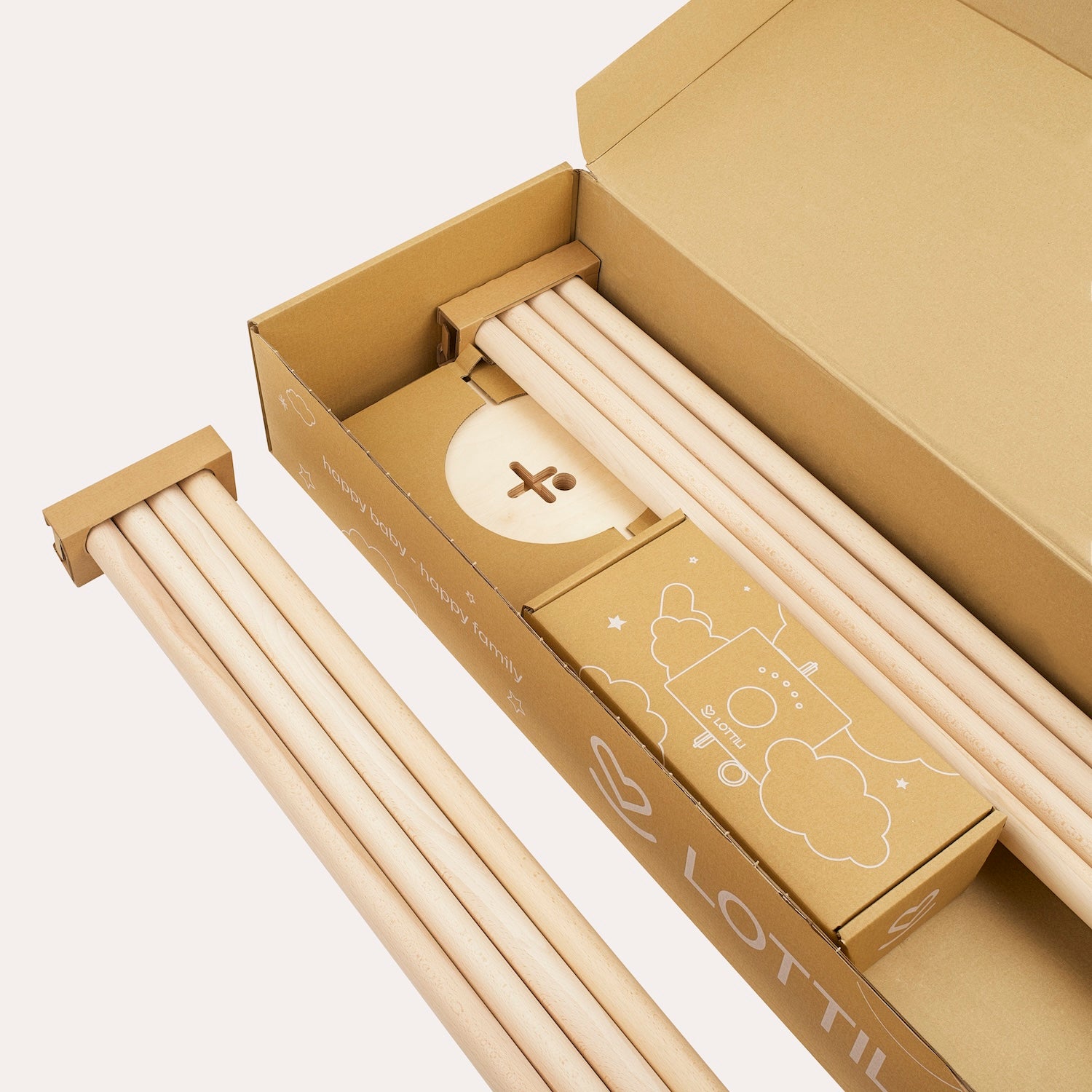Unser Holzgestell, handgefertigt in einer bayerischen Drechslerei, hebt sich mit seinem stilvollen skandinavischen Design von herkömmlichen Stahlgestellen ab. Dieses innovative Federwiegen Gestell überzeugt nicht nur durch sein geringes Gewicht von nur 4 kg, sondern auch durch seine robuste und stabile Bauweise. Dank seiner kompakten Standfläche von etwa 1,2 Quadratmetern passt es flexibel in jeden Raum.